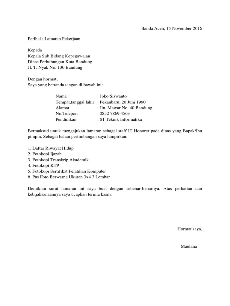 Contoh surat lamaran kerja di pt tulis tangan. Jangan khawatir, kamu bisa melihat contoh dan struktur penulisannya pada artikel bila ingin mengetahui lebih jauh tentang surat lamaran kerja tulis tangan, kamu bisa melihat ketentuan beserta contoh pada uraian di bawah ini! # contoh surat lamaran kerja di bank, pt, dan perusahaan swasta. Seperti contoh surat lamaran kerja yang akan dibahas di poin berikutnya. Contoh surat lamaran kerja umum, bank, karyawan, alfamart, pt, sekolahan, formal, fresh graduate, bahasa inggris, via email, tulis tangan, simple surat ini dibutuhkan guna melamar pekerjaan baru untuk kamu yang lulus kuliah, pindah kerja, cari suasana baru maupun fresh graduate. Sekarang ini contoh surat lamaran kerja yang sesuai dengan eyd di internet sudah sangatlah banyak sehingga anda dapat membaca secara teliti gunakanlah sistematika surat lamaran kerja yang sesuai dengan eyd untuk menunjukkan keseriusan anda dalam melamar pekerjaan, nah untuk. Sebagian perusahaan ataupun penyedia lowongan kerja mewajibkan para pelamar untuk menggunakan tulisan tangan sendiri pada surat. Dokument yang selalu wajib dalam pelamaran kerja iyalah surat lamaran karena sebagai dasar kelengkapan dokument dokument lainnya. Menulis surat lamaran kerja lewat email bukan berarti surat lamaran kerja bisa ditulis dengan sembarangan dan karenanya, tulis surat lamaran kerjamu seperti contoh surat lamaran kerja via email yang baik dan benar 5 contoh terbaru surat lamaran kerja tulis tangan serta strukturnya. Berikut adalah contoh isi surat lamaran kerja tulis tangan: Bagian pembuka surat lamaran kerja jakarta, 20 januari 2020 perihal: Contoh surat lamaran kerja yang baik dan benar. Contoh surat lamaran kerja di bank ii.